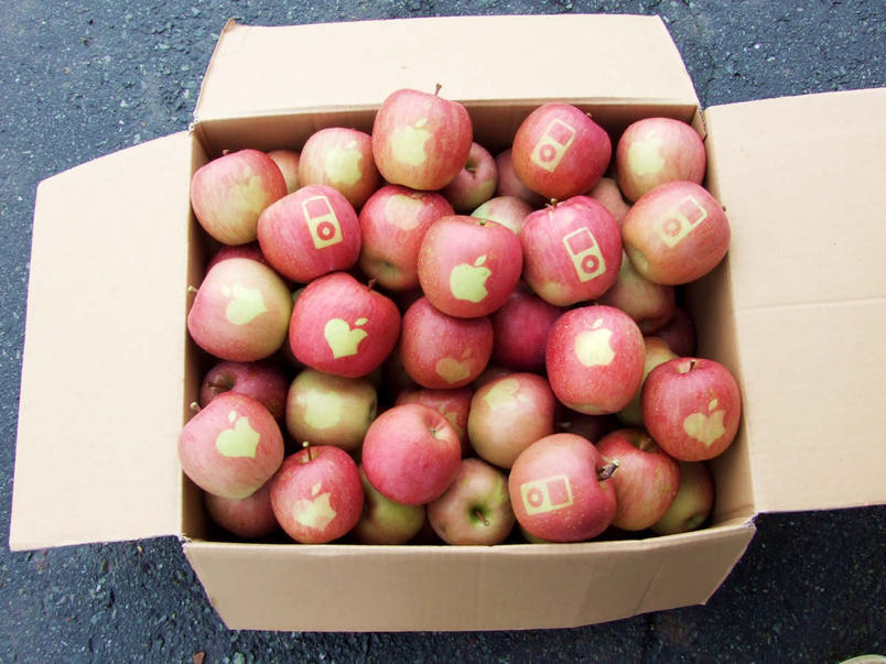 An owner of a Fuji apple orchard printed up custom stickers of iPhones and the Apple logo. He then put the stickers on his Fuji apples while they were still young and on the trees.