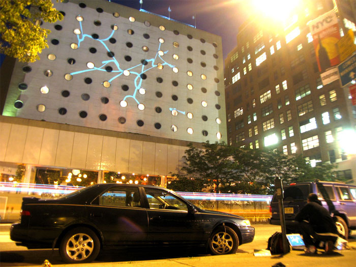 “…The scarf was created when Moving Brands set up a screen of fairy lights in their window and passersby were asked to send messages and drawings via a web interface. The sequence of contributions was then applied to the scarf’s design.”-mocoloco