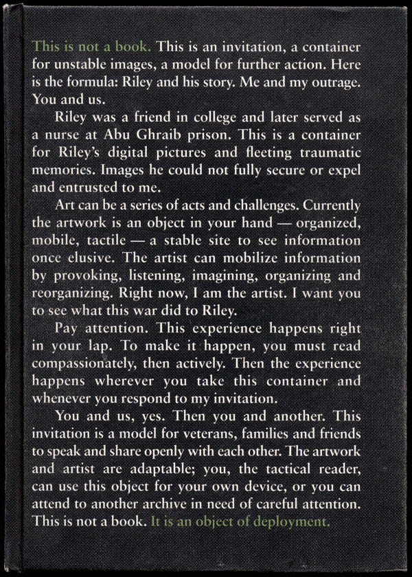 Riley and his story. is the result of a collaboration Monica Haller initiated with Iraq war veteran, Riley Sharbonno. It combines text from their conversations over three years with his images from combat.