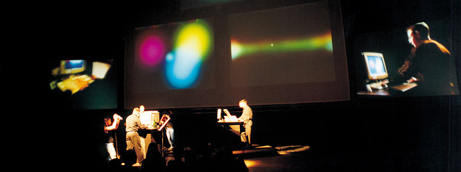 Dialtones (A Telesymphony) (2001-2002: Golan Levin, Gregory Shakar, Scott Gibbons, Yasmin Sohrawardy, Joris Gruber, Erich Semlak, Gunther Schmidl, Joerg Lehner, and Jonathan Feinberg) is a large-scale concert performance whose sounds are wholly produced through the carefully choreographed ringing of the audience’s own mobile phones. Before the concert, participants register their mobile phone numbers at a series of web terminals; in exchange, new ringtone melodies are automatically transmitted to their phones, and their seating assignment tickets are generated. During the concert, the audience’s phones are dialed up by live performers, using custom software which permits as many as 60 phones to ring simultaneously. Because the exact location and tone of each participant’s mobile phone is known in advance, the Dialtones concert is able to present a diverse range of unprecedented sonic phenomena and musically interesting structures, such as waves of polyphony which cascade across the audience. Dialtones was presented at the Ars Electronica Festival in September 2001, and at the Swiss National Exposition in May and June of 2002.