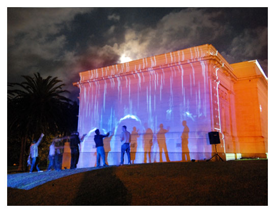 Beneath is an outdoor interactive installation inspired by the underwater world. The visual interaction creates experiences of being in the underwater world. It allows audiences to explore undiscovered territories and experience the unique visual expression of natural elements. The invisible natural world becomes visible and accessible in an “unusual” real-space. Beneath consists of a series of 5 visual elements: ‘Water Ray’, ‘Turbulence’, ‘Dropping Star’, ‘Water Cloud’ and ‘Flying Jellyfish’. The visual elements express the energy, living conditions and living organisms of the underwater world. It embraces communication in a silent world through gestures of interaction and abstraction using computer technology and motion tracking.