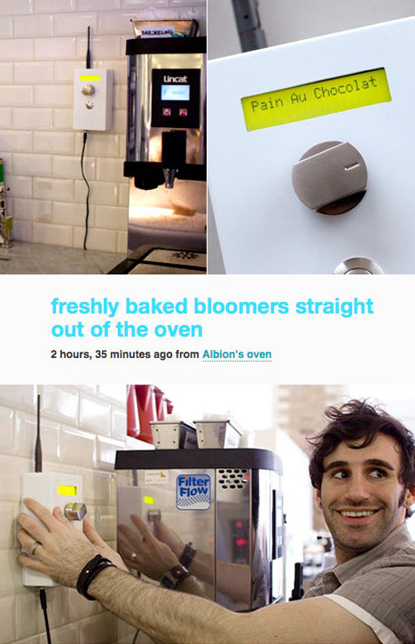 The first BakerTweet device has been installed at the Albion Cafe on Boundary Street in Shoreditch, London. To find out what’s cooking follow @albionsoven on Twitter.