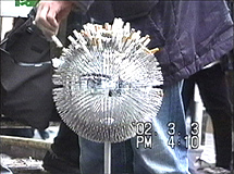In order to encourage people to put a cigarette butt on the object , Masuyama stuck ten of dummy cigarettes on it. As a result of that, people understand such a strange, unknown and unidentified object as an ashtray and started to put butts into a spine as he expected. It was a multiplier effect that the more cigarettes were put on it, the more the object looked like an ashtray. Naturally enough, smokers started gathering around the Ike-moku.